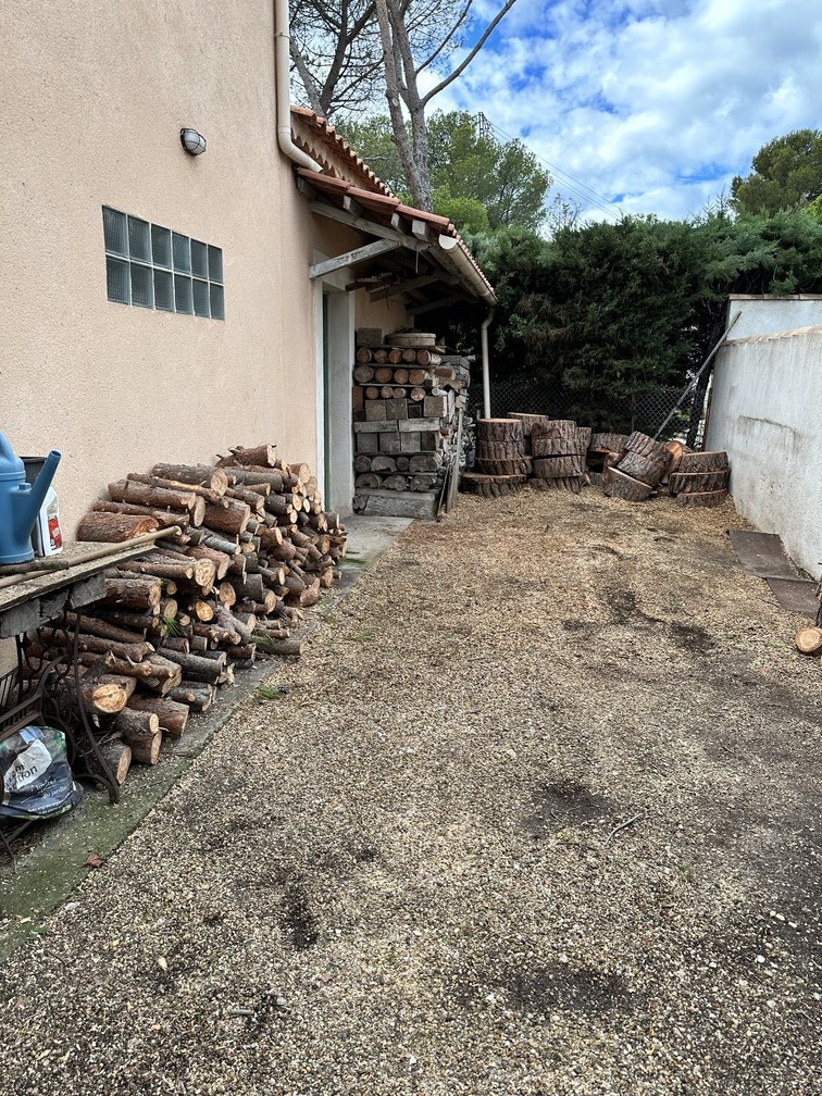 Chantier d’abattage d’un Pin Parasol et rognage de sa souche.